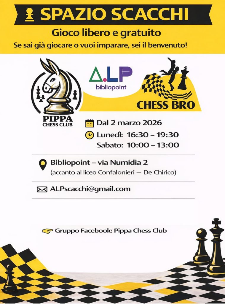 A partire dal 2 marzo, tutti i lunedì dalle 15 alle 18 si gioca a scacchi con il maestro Artem Marchenkov di Pippa Chess Club. Per chi sa già giocare, chi vuole imparare, piccoli & grandi. Anche il sabato mattina (a partire dal 7 marzo), dalle 10 alle 13. Gioco libero e gratuito.