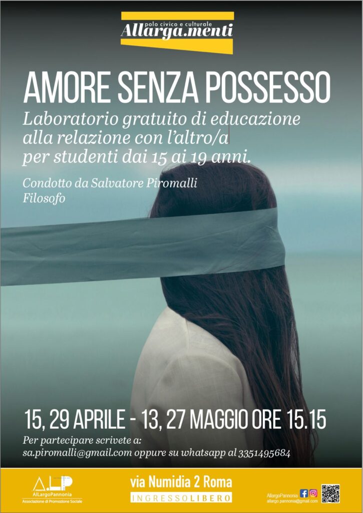 Ti aspettiamo tutti i martedì dal 24 marzo al 5 Maggio ore 15.30 – 17.30 presso Allarga.menti, Via Numidia 2, Roma.